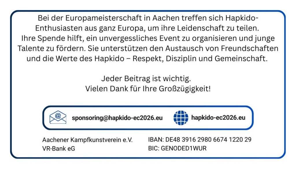 Am 6. und 7. Juni 2026 ist es endlich so weit: Die europäische Hap Ki Do – Elite trifft sich in der traditionsreichen Stadt Aachen, um gemeinsam die Hap Ki Do Europameisterschaft 2026 zu feiern – ein sportliches Highlight, das Kampfkunst, Respekt und Gemeinschaft auf höchstem Niveau vereint.